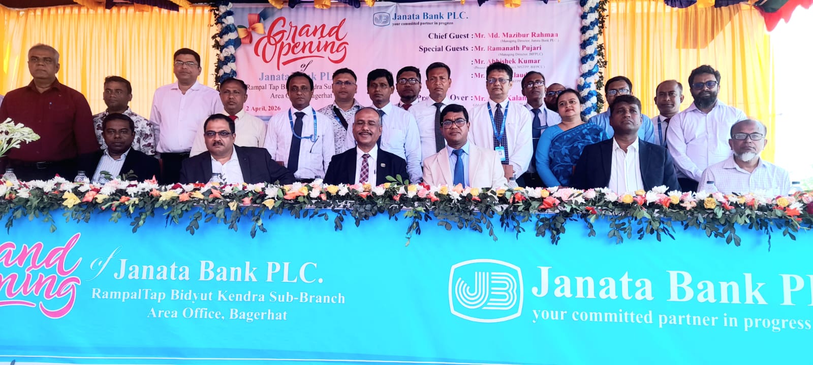 জনতা ব্যাংক খুলনা ডিভিশনাল জেনারেল ম্যানেজার আবুল কালাম আজাদের সভাপতিত্বে অনুষ্ঠিত উদ্বোধনী অনুষ্ঠানে প্রধান অথিতির বক্তব্য দেন, জনতা ব্যাংকের ব্যাবস্থাপনা পরিচালক মো. মুজিবর রহমান। বিশেষ অথিতির বক্তব্য দেন রামপাল তাপবিদ্যুৎ কেন্দ্রের ব্যাবস্থাপনা পরিচালক মি. রমানাথ পূজারী, রামপাল তাপবিদ্যুৎ কেন্দ্রের প্রকল্প পরিচালক মি. অভিষেক কুমার, তাপবিদ্যুৎ কেন্দ্রের উপ পরিচালক মো. আলাউদ্দিন প্রমুখ। এসময় উপস্থিত ছিলেন রামপাল তাপবিদ্যুৎ কেন্দ্রের পরিচালক জিএম তারিকুল ইসলাম, রামপাল উপজেলা বিএনপির সভাপতি শেখ হাফিজুর রহমান তুহিন, রামপাল উপজেলা সচেতন নাগরিক সমাজের সদস্য সচিব এম, এ সবুর রানা, জনতা ব্যাংকের বিভিন্ন পর্যায়ের কর্মকর্তা, তাপবিদ্যুৎ কেন্দ্রের কর্মকর্তা ও রাজনৈতিক দলের নেতৃবৃন্দ।